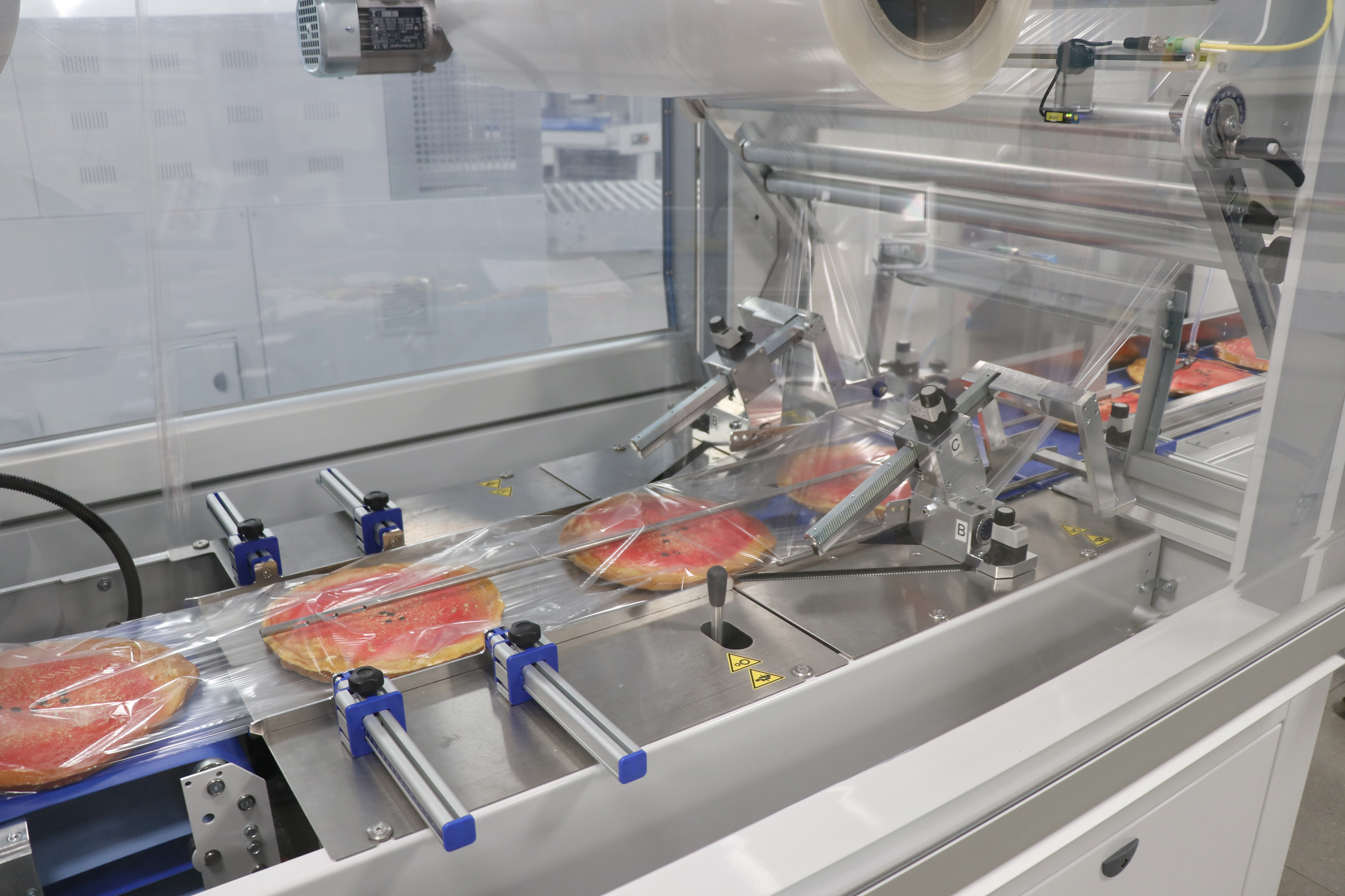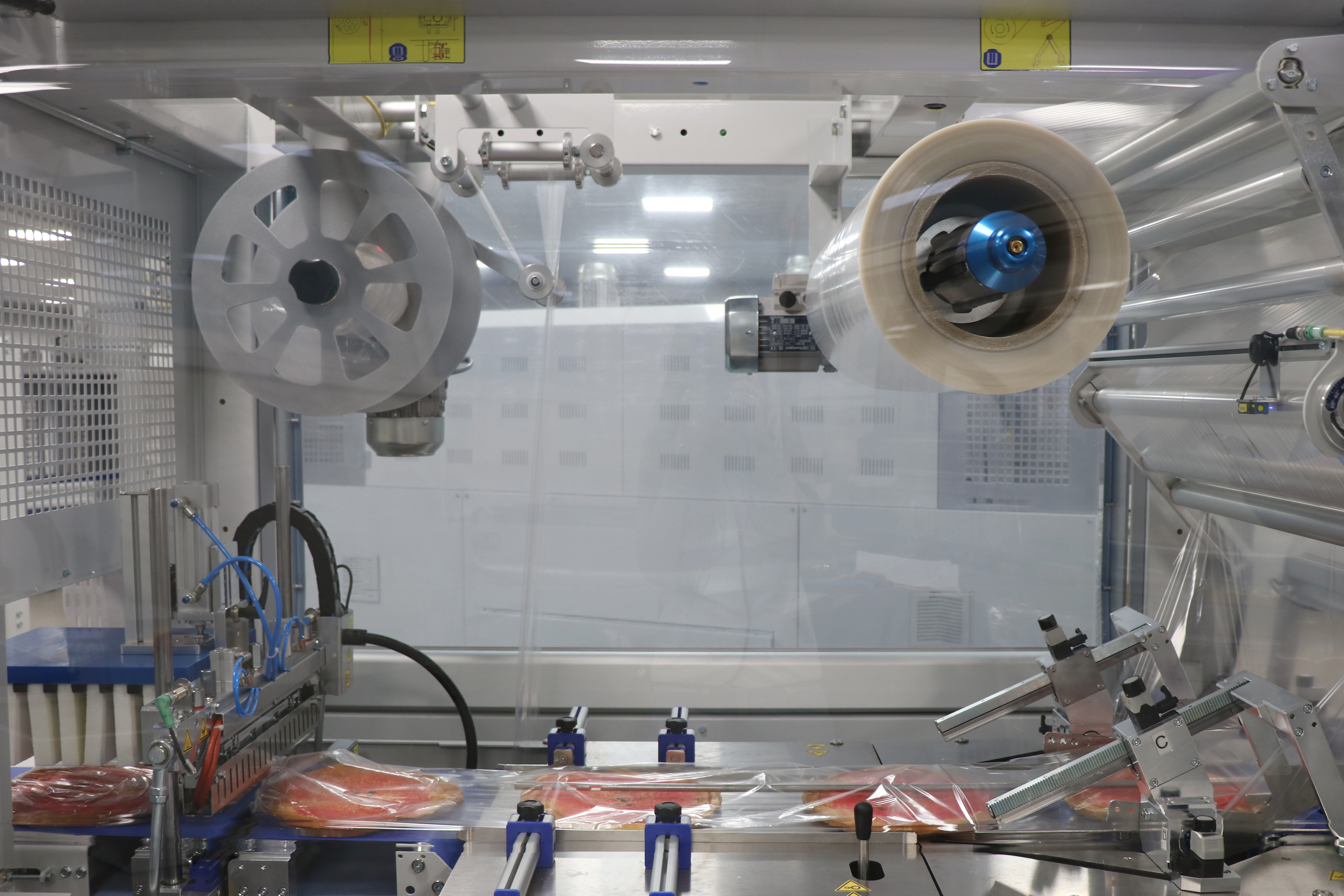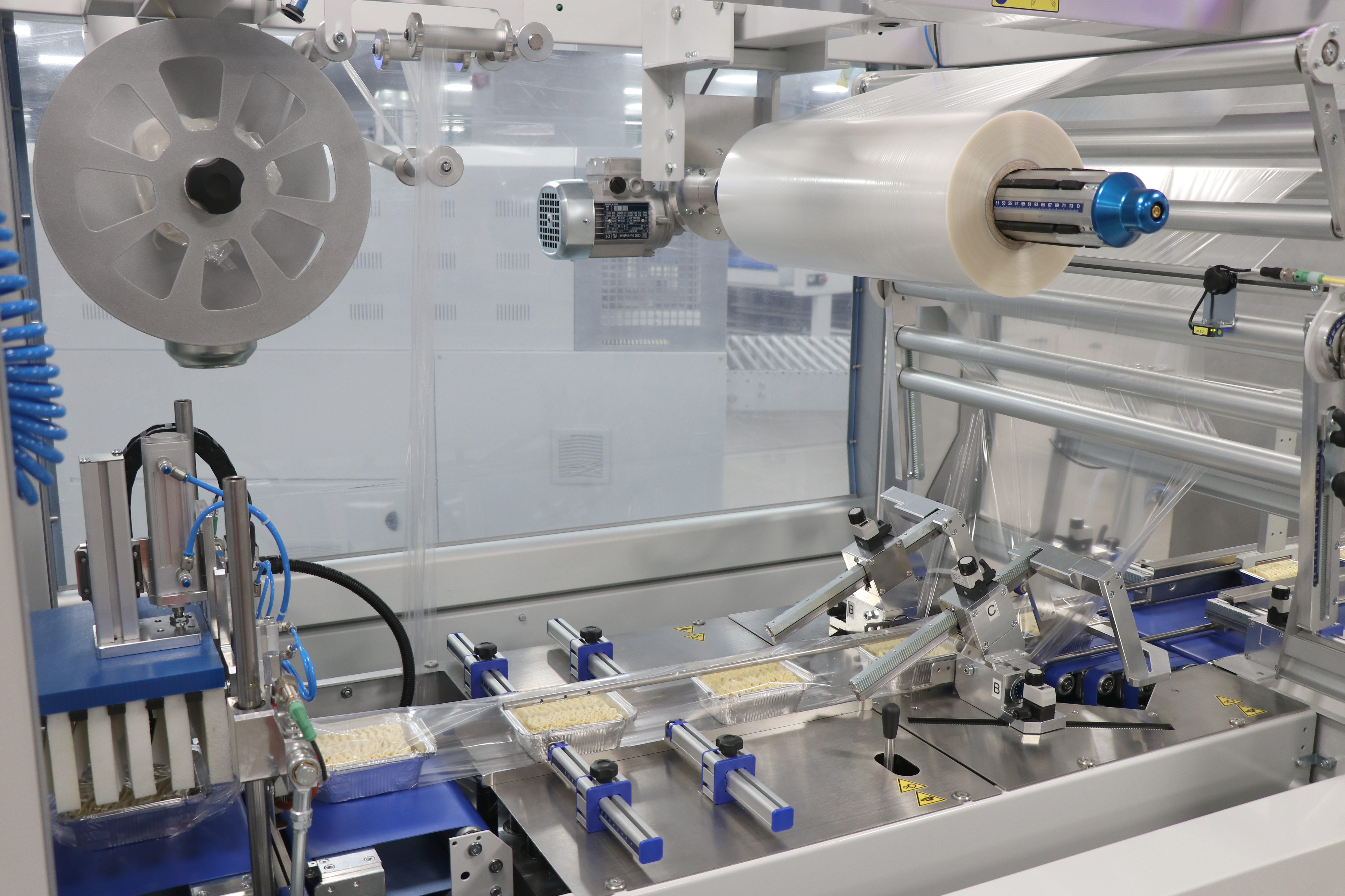Flow pack machines with box motion sealing and lower film reel + shrink tunnel
