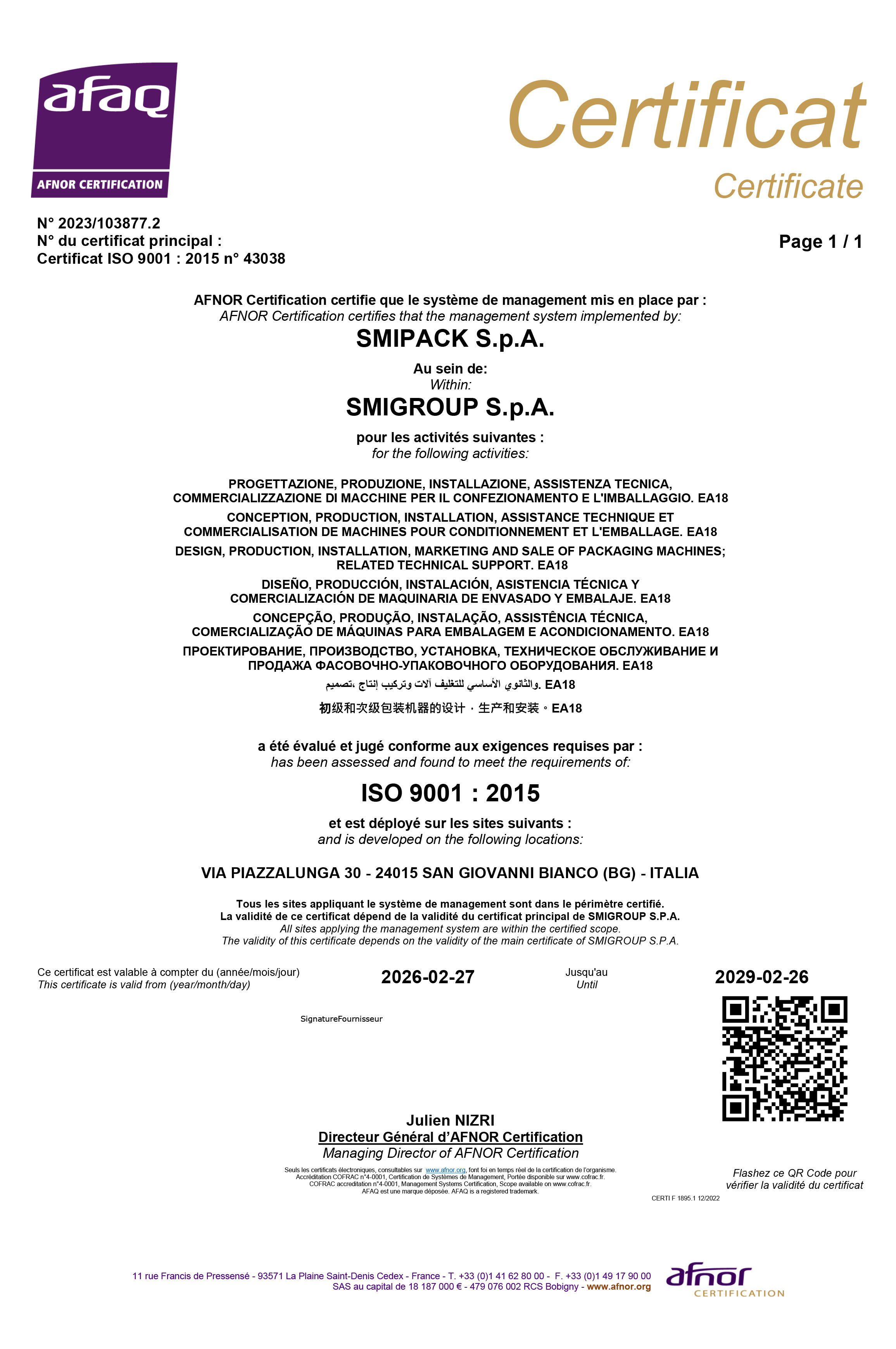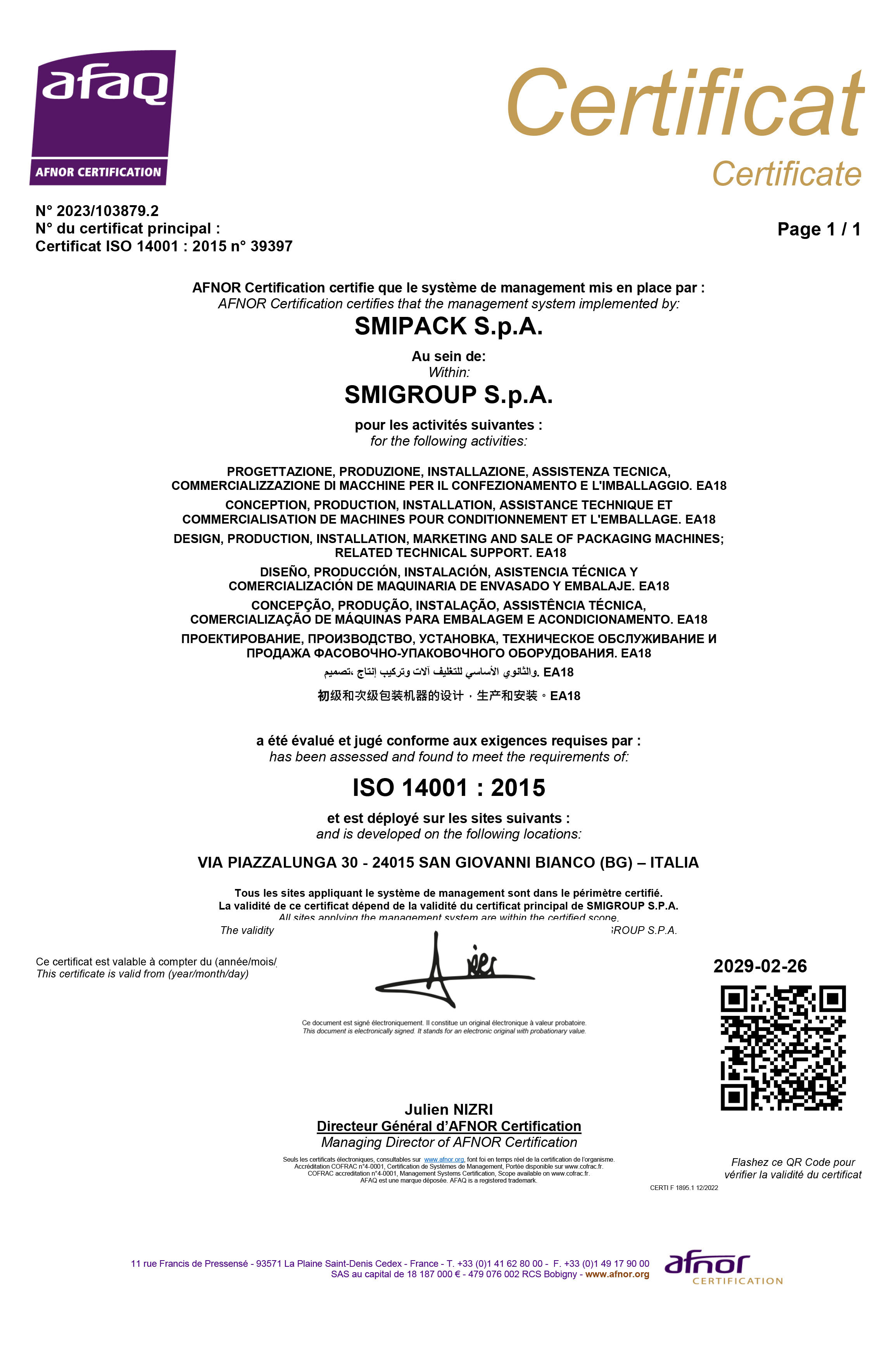 As empresas do Grupo SMI adotam um Sistema de Gestão Integrado de Qualità, Ambiente e Segurança de acordo com as normas UNI EN ISO 9001:2015 (Sistema Gestão de Qualidade), UNI EN ISO 14001:2015 (Sistema Gestão Ambiental) e UNI EN ISO 45001:2018 (Sistema de Gestão de Segurança e Saúde Ocupacional).